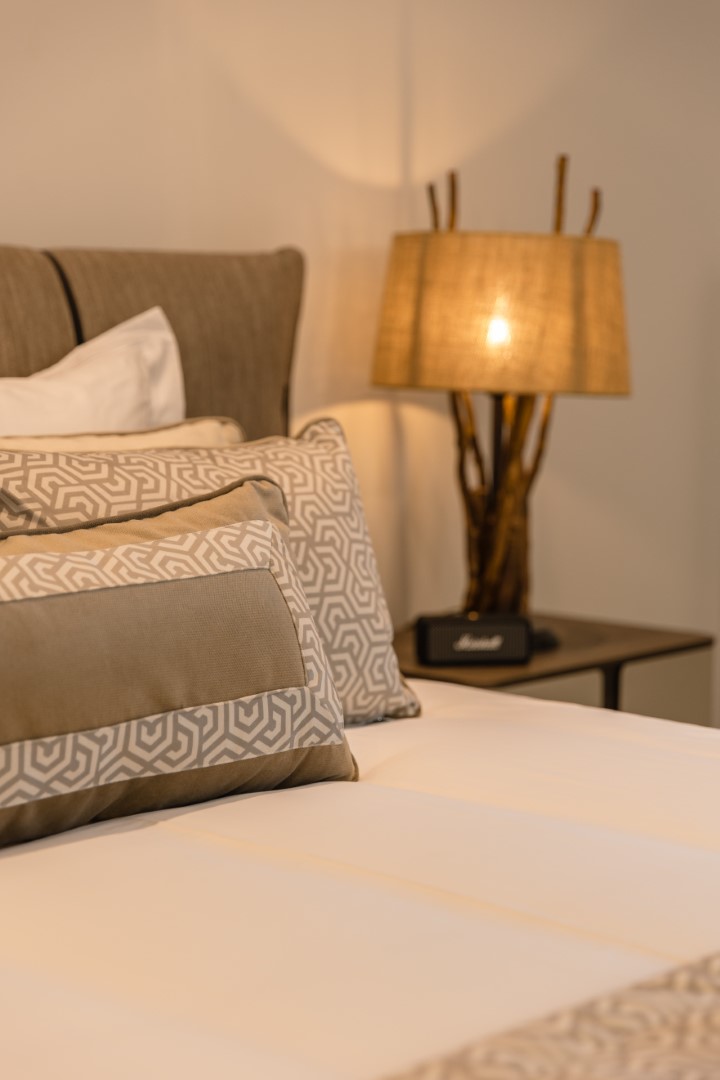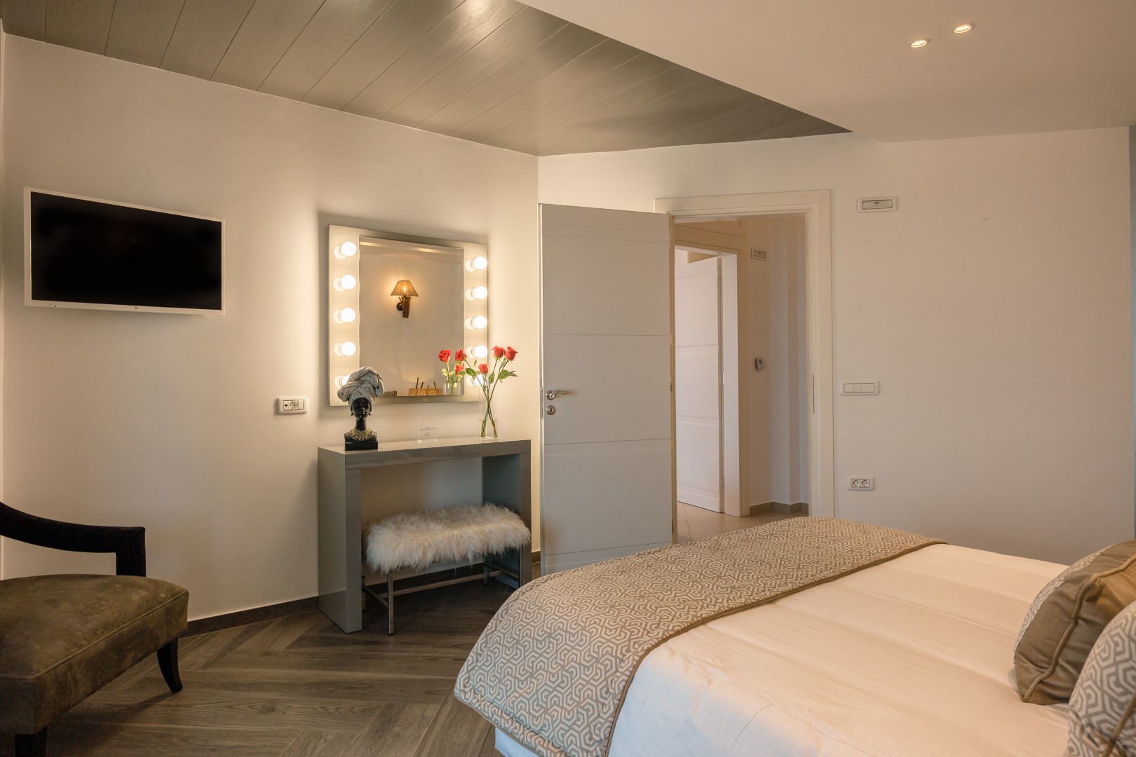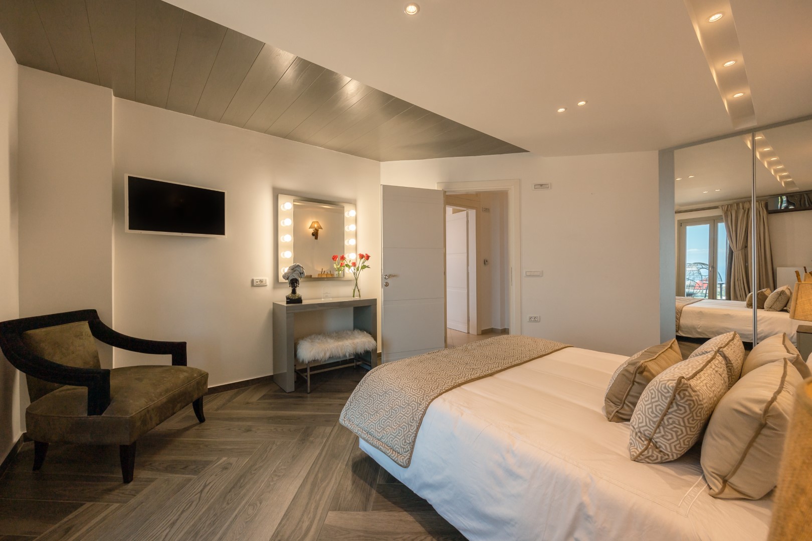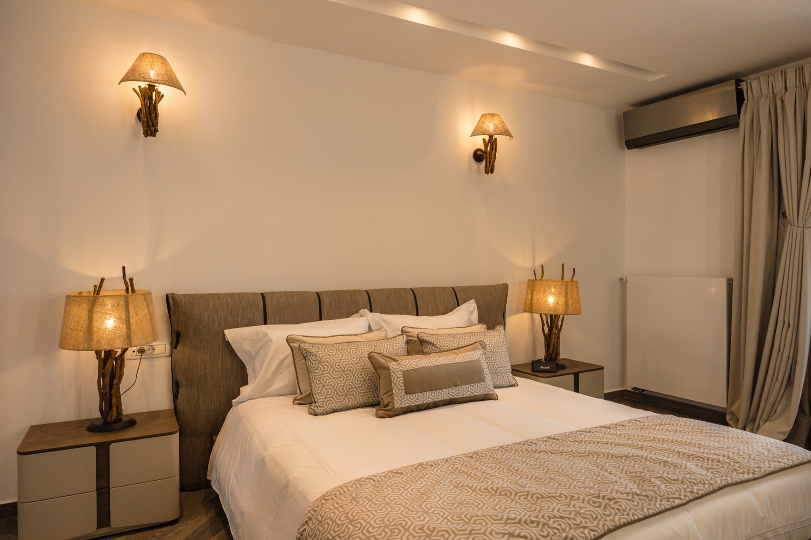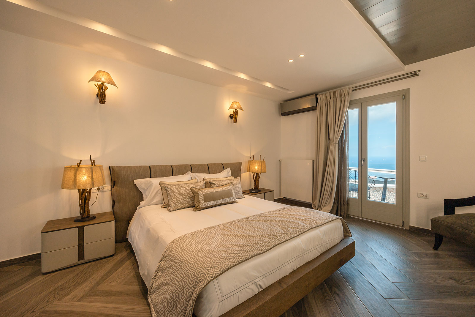 Step into the bedroom at Santorini Grand Luxury Villas, and you'll be greeted by an oasis of tranquility. The carefully curated interior design exudes luxury and sophistication, with a soothing color palette, soft linens, and elegant furnishings. The plush king-sized bed invites you to sink into its comfort, ensuring a restful night's sleep. Wake up to stunning views of the azure sea from the bedroom window, and start your day in Santorini feeling rejuvenated and inspired