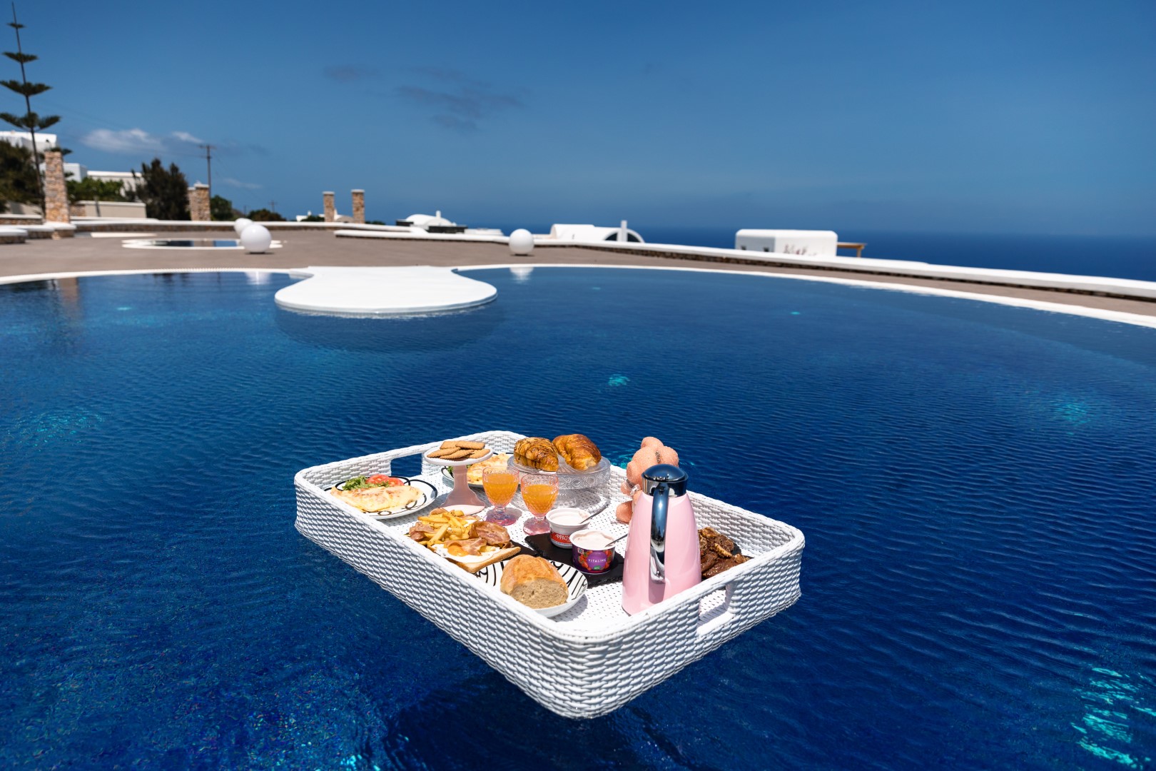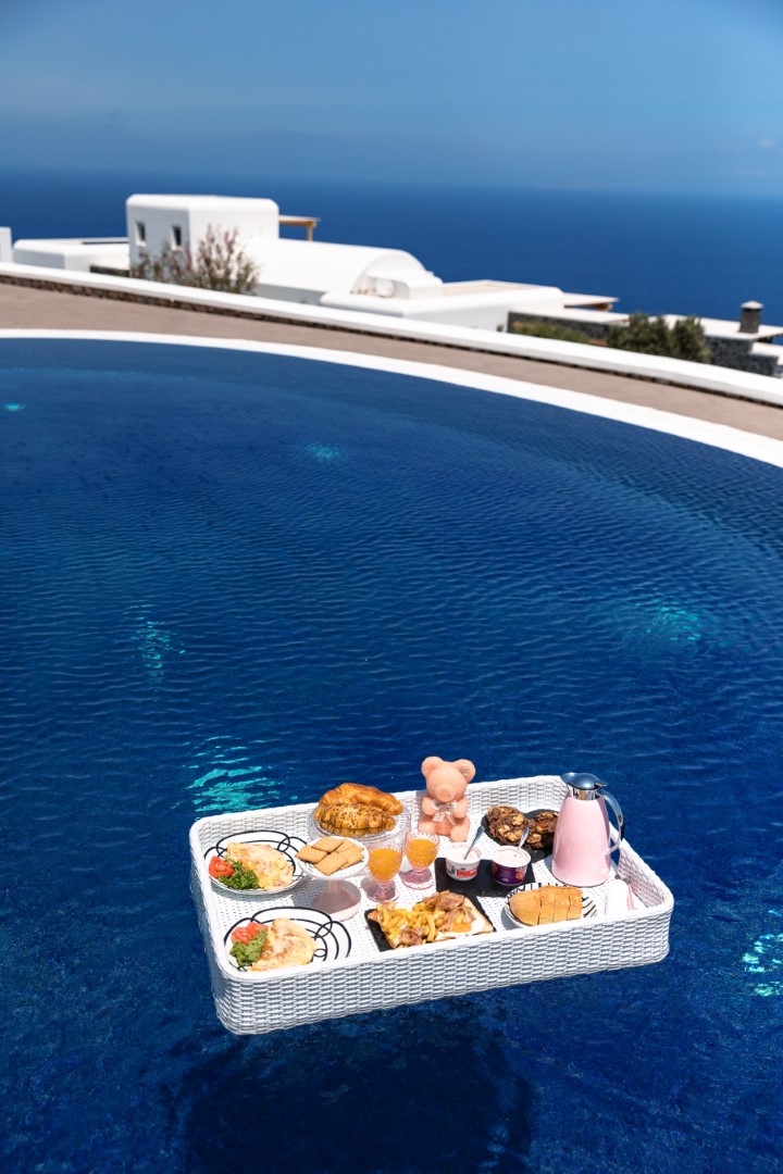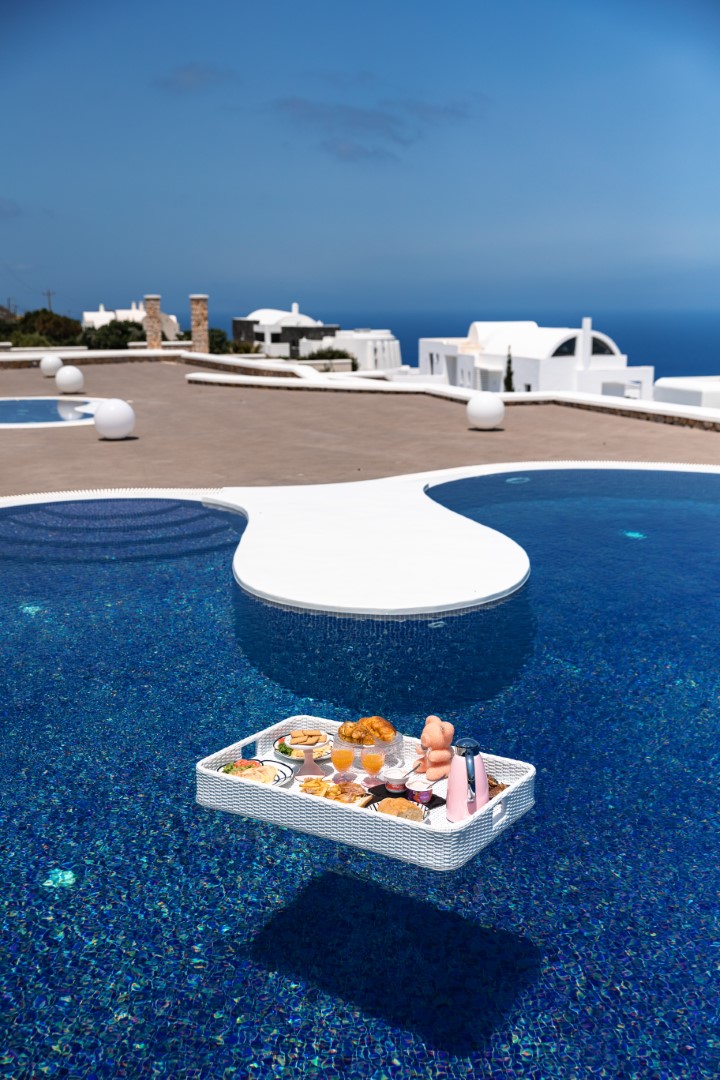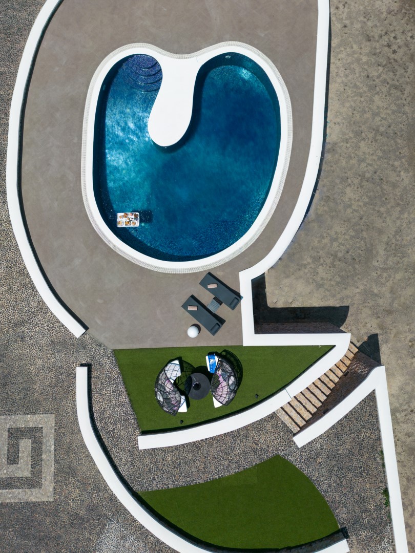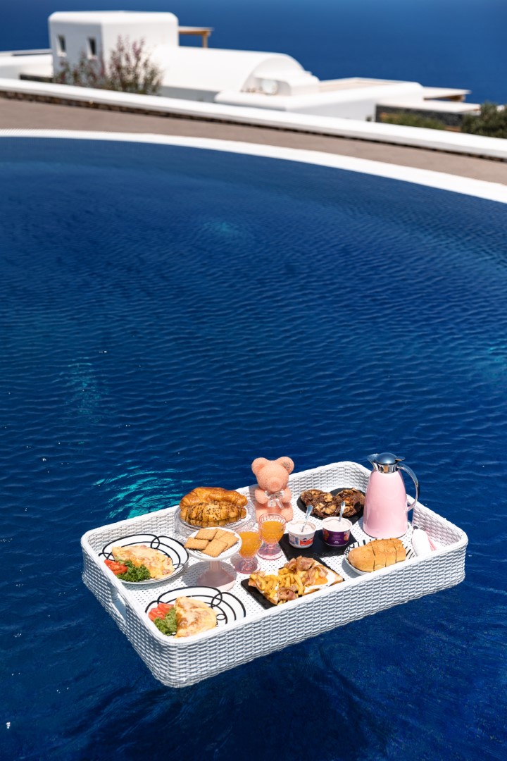 The pool area at Santorini Grand Luxury Villas is a true sanctuary of luxury and tranquility. Take a refreshing dip in the private infinity pool, surrounded by stunning views of the Aegean Sea and the island's majestic cliffs. Lounge on the comfortable sunbeds and bask in the Mediterranean sunshine, or seek shade under the parasols while sipping on a refreshing cocktail. As the day fades into evening, witness magical relaxation by the pool, creating a moment of sheer beauty and serenity